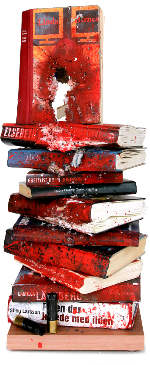 Books were shot! A coworker is also a hunter, so he took a pile of discarded books, shot them and smeared red paint all over. (By the way, guns are strictly prohibited in all forms in Denmark except from hunters.)