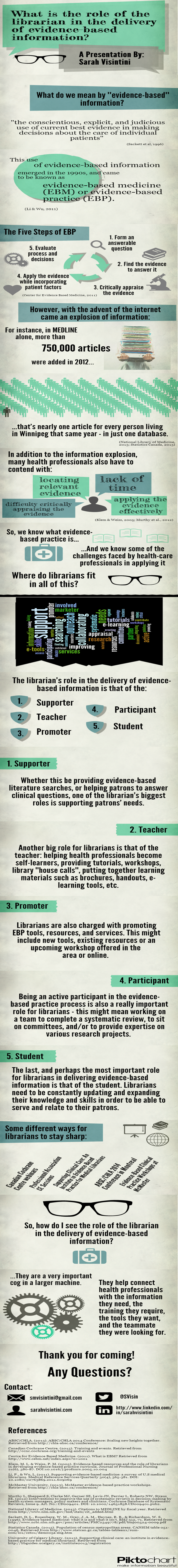 Robin Featherstone is an embedded research health librarian for the Department of Pediatrics at the University of Alberta. Her infographic was presented at the 2014 Canadian Health Libraries Association (CHLA) Annual Conference in Montreal. In it, Robin describes two different projects used to promote research through social media. It was created using Piktochart and is an excellent example of the use of infographic presentation to convey project results.