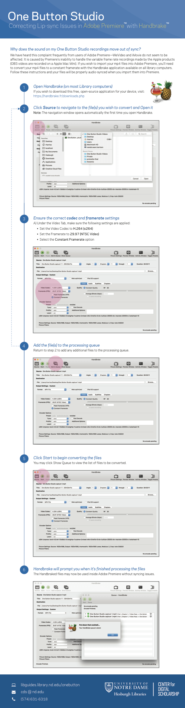 Penn State University has created an game-changing resource for educators and students interested in creating high-quality videos: One Button Studio. This studio room + tech app set-up has been replicated at several colleges, universities, and libraries, including the University of Notre Dame’s Hesburgh Library. Today’s post features One Button Studio instructional handouts/flyers by Randal Sean Harrison, Emerging Technologies Librarian at the Hesburgh Library. Created using Adobe Illustrator, Randal’s flyer design and accompanying LibGuide are extremely helpful to libraries and institutions building or contemplating a One Button Studio installation.